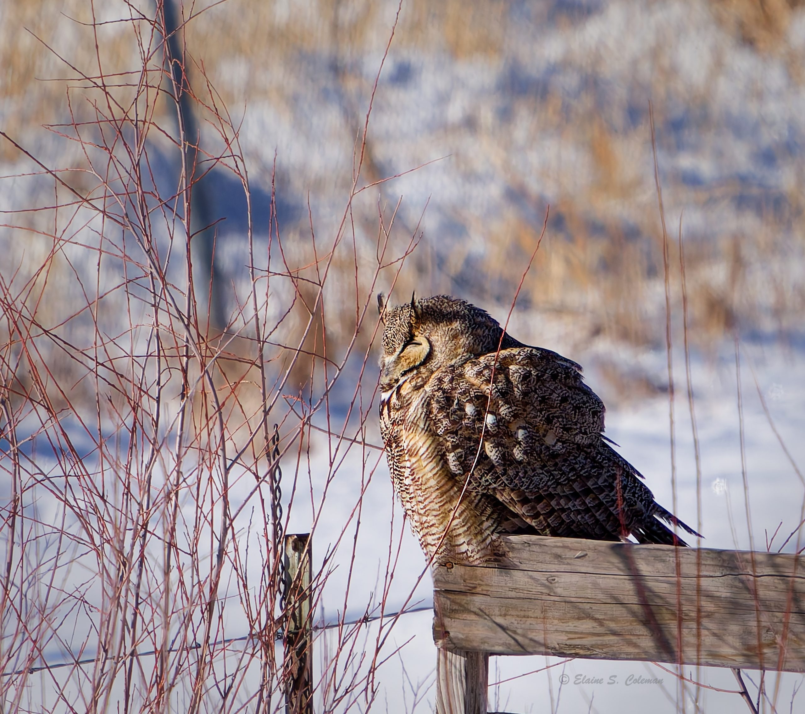 Who’s awake? Me too! Who’s awake? Me too! In the bleak midwinter, this series of five rhythmic, muffled, slightly eerie hoots – all on one pitch – wafts through the darkness. The sentinel taking attendance is the Great Horned Owl. Measuring nearly 2 feet from head to tail, the Great Horned is the largest and most widespread owl in North America. Seen most commonly perched upright in trees or on power poles at dusk, this owl is heavily barred in brown and black. Feather tufts (not horns at all, despite its name) on its large head give rise to its rather inaccurate, albeit catchy, common name. Its enormous yellow eyes are so large that they cannot move in the owl’s head. However, the owl can swivel its head as much as 270 degrees to look in any direction. Since Great Horneds hunt at night, locating prey by sound is vital – and this owl has the requisite acute hearing. With a skull nearly as wide as its body, its ears are set relatively far apart and offset from each other a bit, allowing the raptor to triangulate the location of the tiniest sounds even more accurately.
