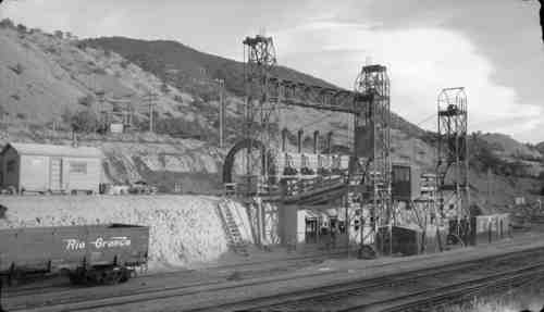 This spot between Salida and Cleora is not exactly a “ghost town,” since it never was a town. It was a siding named Barrel, where the railroad used a rotary dump to transfer limestone from the narrow-gauge cars that served the Monarch Quarry to the standard-gauge cars that served the CF&I steel mill in Pueblo. The machinery was erected in 1924, and was used until 1956 when the Monarch branch was converted to standard-gauge; the branch was abandoned in 1984.